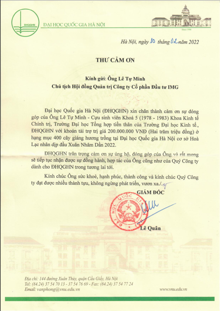 With the desire to contribute useful values to the community and society, Mr. Le Tu Minh - Chairman of the Board of Directors of IMG Joint Stock Company sponsored 200 million VND for Vietnam National University Hanoi, Hoa Lac campus on the occasion of the first Spring of the Year of the Tiger 2022.