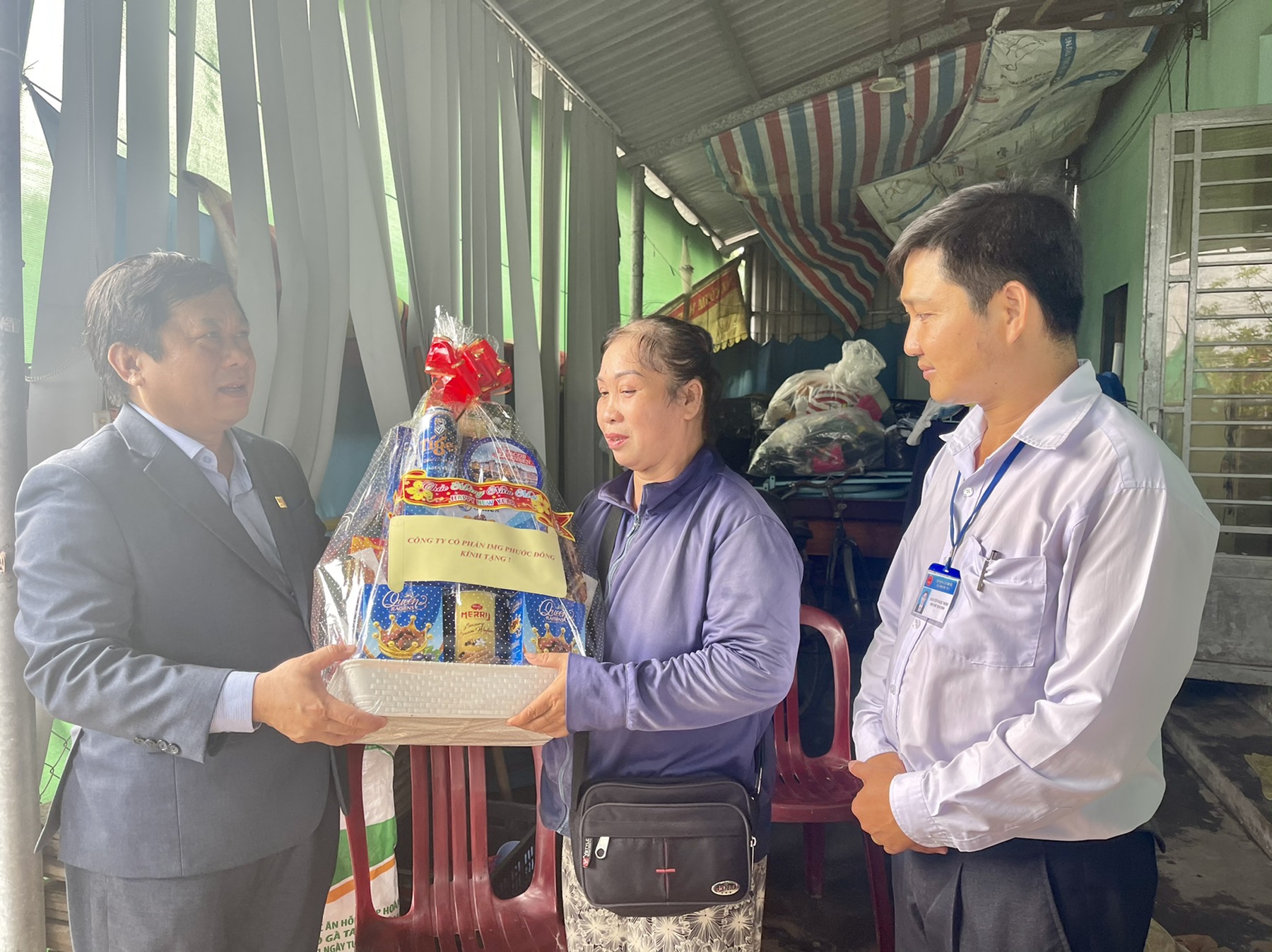 General Director of IMG Phuoc Dong Company - Ho Van Tri (right) visited and gave gifts to the family of Ms. Thai Thi Lat in Hamlet 5, Phuoc Tuy Commune, Can Duoc District.