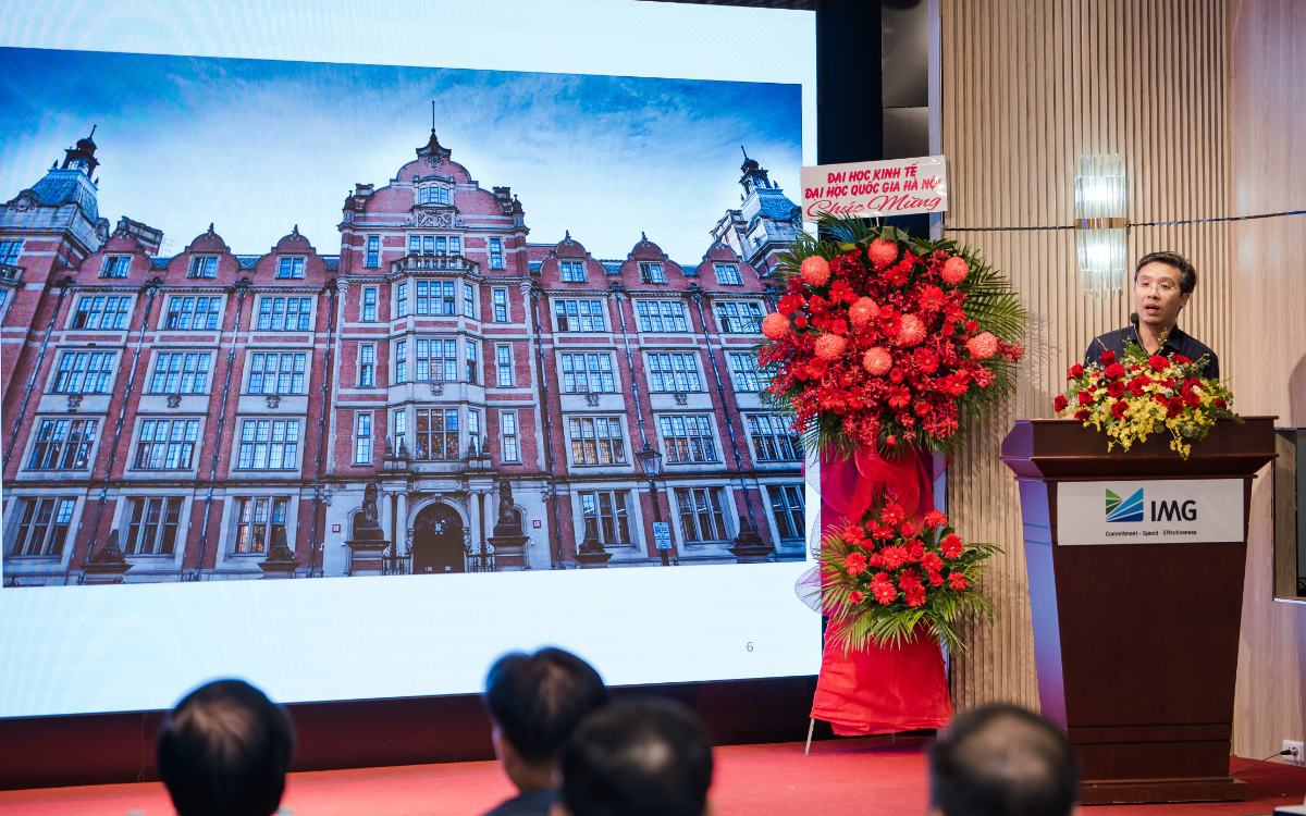 Trong bài phát biểu, ông Lê Tự Minh, Chủ tịch Hội đồng Quản trị IMG, khẳng định: “IMG tự hào là đối tác chiến lược của Trường Đại học Kinh tế, ĐHQGHN, không chỉ tài trợ tài chính mà còn đồng hành phát triển dự án này. Đây là minh chứng cho cam kết của chúng tôi trong việc kiến tạo những công trình biểu tượng, góp phần nâng cao giá trị giáo dục và phát triển cộng đồng.”