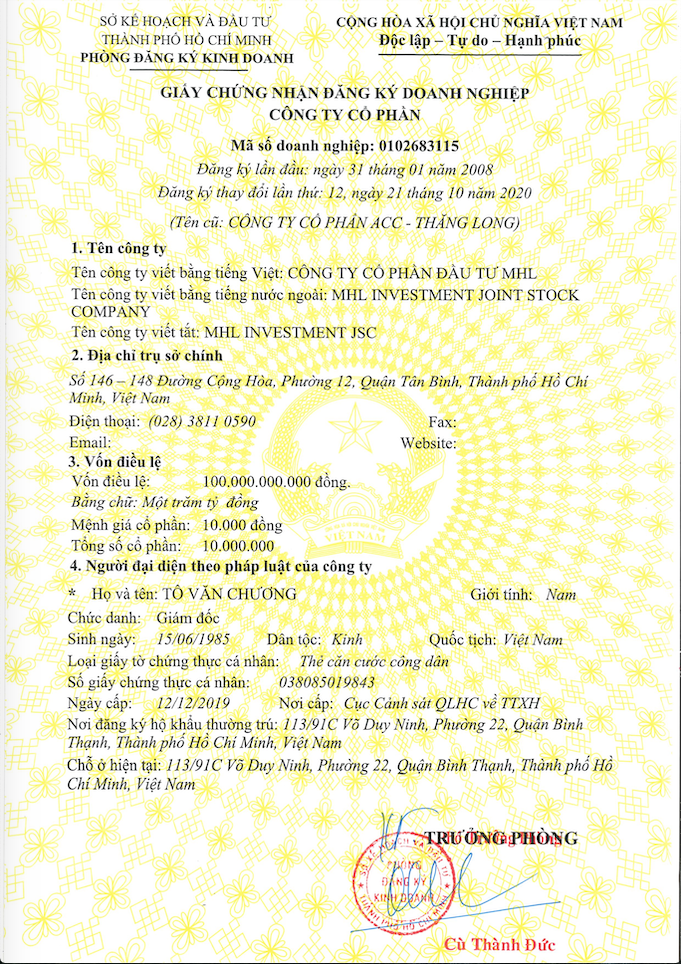 Article 2. Since the day 21/10/2020 MHL Investment Joint Stock Company official use company name according to the information that was modified. The old information about the company name no longer has legal validity from the date of 21/10/2020. All forms use the old name of the company to represent our company in transaction and relationships with customers are forged and contrary to law.